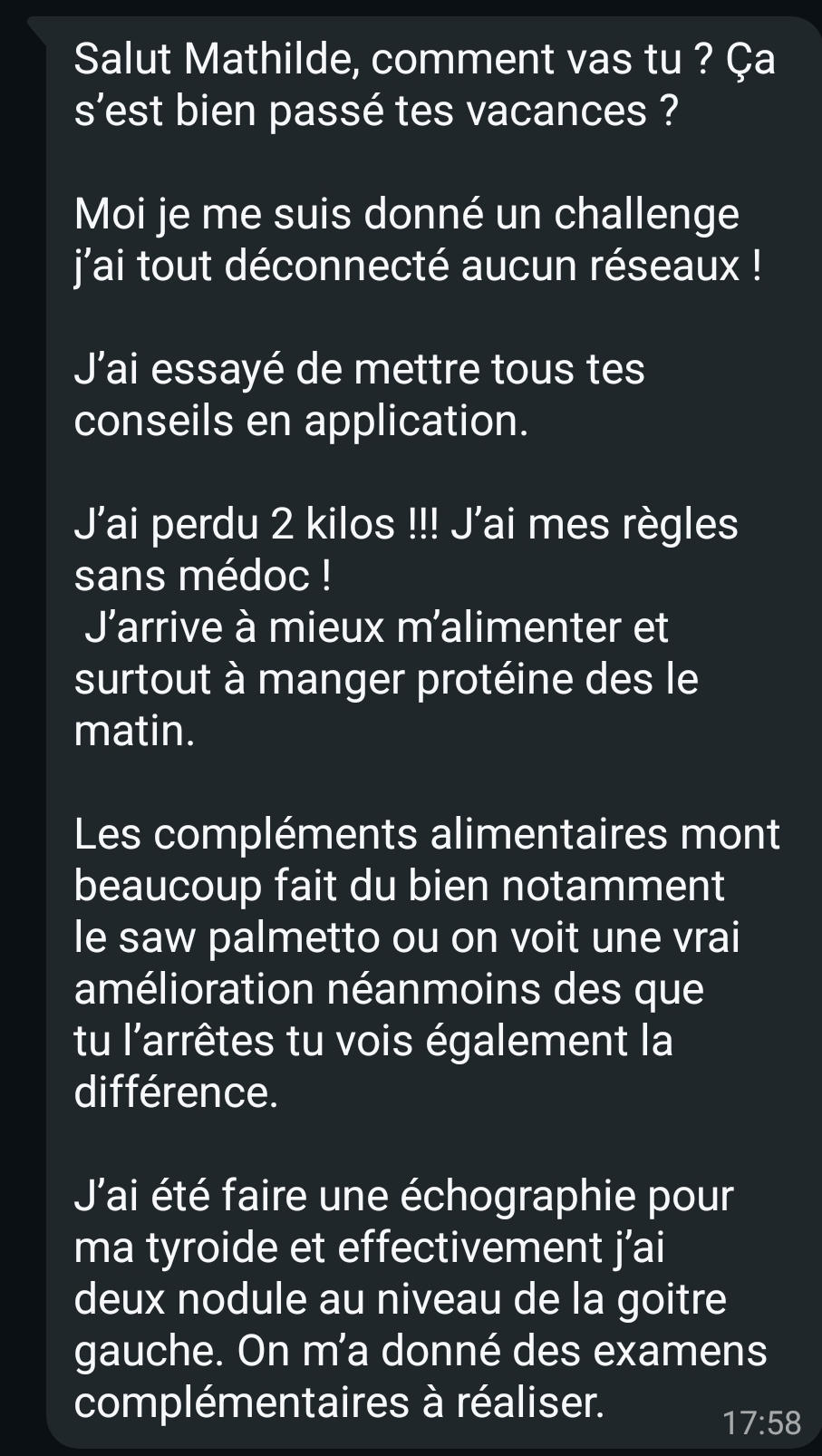 Bonne nouvelle : ta mutuelle peut rembourser tout ou une partie du suivi ! Pense à vérifier, certains accompagnements peuvent même être 100 % pris en charge. TU HESITES ? Je t’invite à prendre un RDV Bilan pour que l’on discute de tes besoins et de tes objectifs